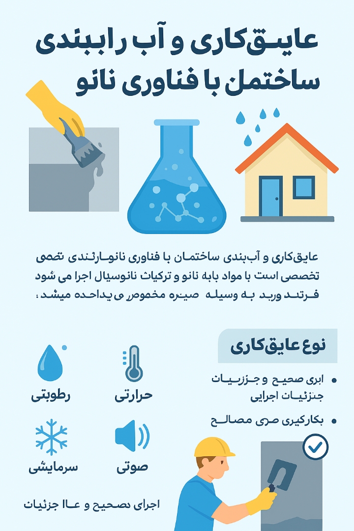 تحول و پیشرفت در عایقکاری با فناوری نانو:فناوری نانو با ورود به صنعت ساختمان،نسل جدیدی از عایق های رطوبتی را معرفی کرده که با ساختار مولکولی پیشرفته،عملکردی فراتر از روشهای سنتی دارند.این مواد با نفوذ به عمق مصالح،سطحی کاملاً ضدآب،مقاوم ،پایدار و انعطافپذیر ایجاد میکنند.مواد نانوسیال خود ترمیم مایع برای لوله فاضلاب،می توانند با حرکت در داخل لوله،محل سوراخ،ترک،درز و شکستگی را بدون نیاز به دسترسی مستقیم و تخریب و ایزوله نماید.