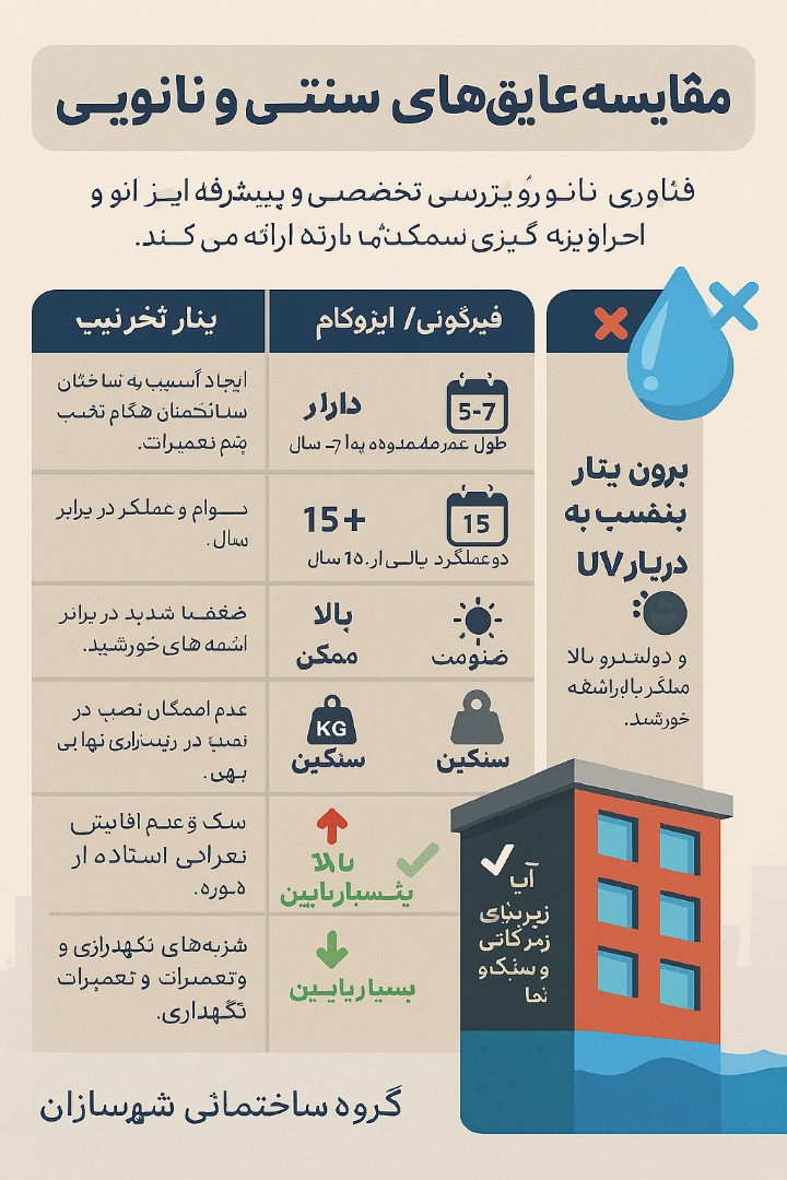 قیرگونی و ایزوگام،نیاز به تخریب و زیرسازی دارد،عمر مفید کمتر،مقاومت در برابر سرما و گرما،آسیب در برابر نشست،هزینه نصب بالا،تعمیرات سخت،وزن بالا عایق نانو و نانوسیال،عدم نیاز به به تخریب،نصب و اجرای آسان تر،مقاومت در برابر سرما و گرما،منعطف و ایمنی،طول عمر بالا،عدم نیاز به زیرسازی،قابل اجرا روی سطوح روکار و توکار،هزینه نگهداری خیلی کمتر