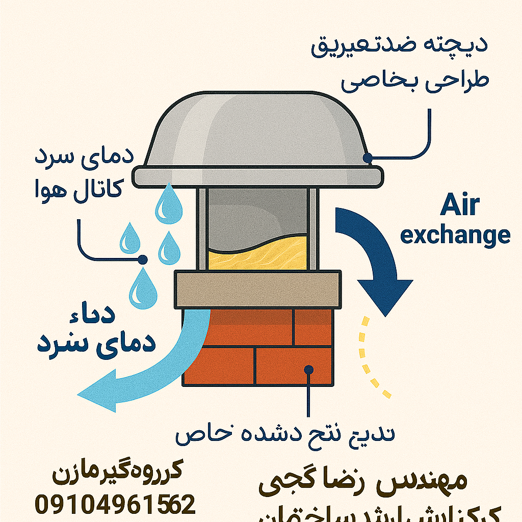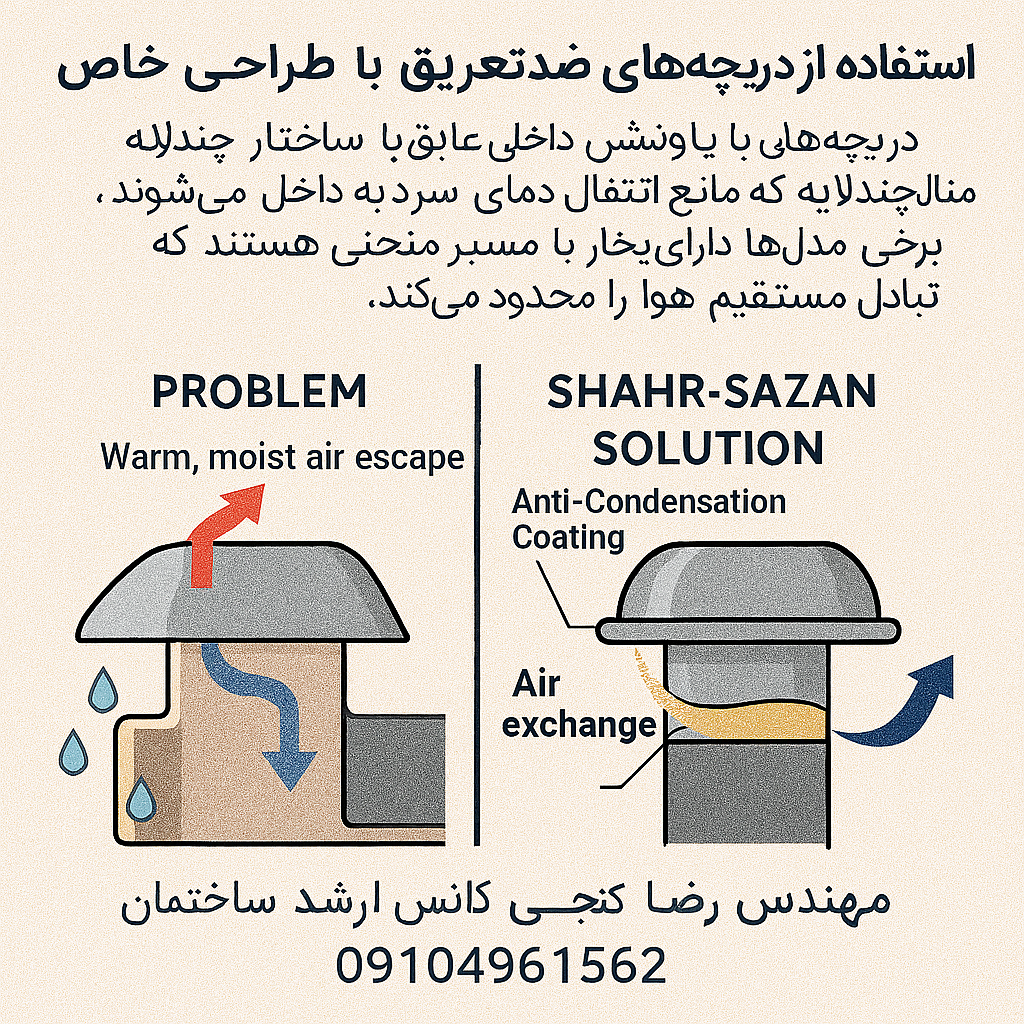 استفاده از دریچههای ضدتعریق با طراحی خاص و عایق کاری شده با نانو و الاستیک:دریچههایی با پوشش داخلی عایق یا ساختار چندلایه که مانع انتقال دمای سرد به داخل میشوند.برخی مدلها دارای تله بخار یا مسیر منحنی هستند و تبادل هوا را محدود میکند.