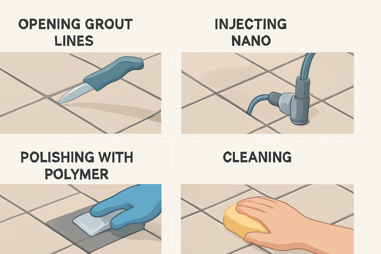 ٢.تزریق در زیرسازی،تزریق مواد نانویی به زیر کاشی یا درزها برای ایزولاسیون عمقی،یعنی قیرگونی و ایزوگام پوسیده و از بین رفته و در مقابل نفوذ آب مقاومت کافی و لازم را دارد.از مواد نانو و پلیمری در این مدل با تضمین کیفیت استفاده می گردد.تزریق یا پوششدهی با مواد نانویی و پلیمری.مواد عایق بهصورت مایع بی رنگ و نفوذگر روی سطح یا داخل زیرسازی تزریق یا پخش میشوند.و بعداز خشک شدن اجازه نفوذ آب و رطوبت به سطوح دیگر را نمی دهند.