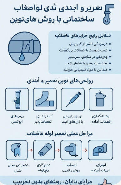 ترمیم و لوله و اتصالات فاضلاب با مواد کامپوزیتی: مخصوص لولههای قدیمی و ترکخورده،بهویژه چدنی ها و اتصالات برنجی و فلزی است.این مواد به صورت مایع در داخل لوله و یا بحالت خمیری روی بدنه آنها اجرا می شود.تقویت و ترمیم لوله های با عمر بالا و سازه قدیمی موثر است.